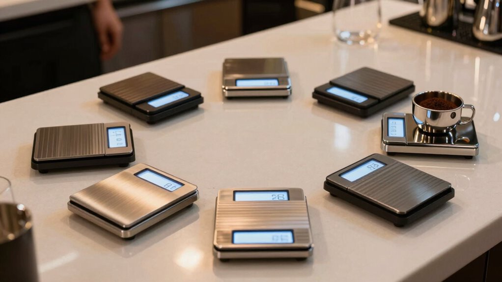 When choosing an espresso scale, size and portability are key factors that can profoundly influence your brewing experience. Compact scales, typically between 4 to 8 inches long, fit easily under most espresso machines and pour-over setups, saving valuable space. Lightweight models, weighing under a pound, are perfect for outdoor brewing or travel, making them highly portable. Slim designs, less than an inch thick, allow for simple storage and handling without losing measurement accuracy. Some models feature foldable or detachable components, enhancing mobility for baristas on the go. A small footprint is essential for tight kitchen spaces and crowded countertops, helping you stay organized during busy brewing sessions. Prioritizing these aspects guarantees your scale complements your setup and lifestyle seamlessly.