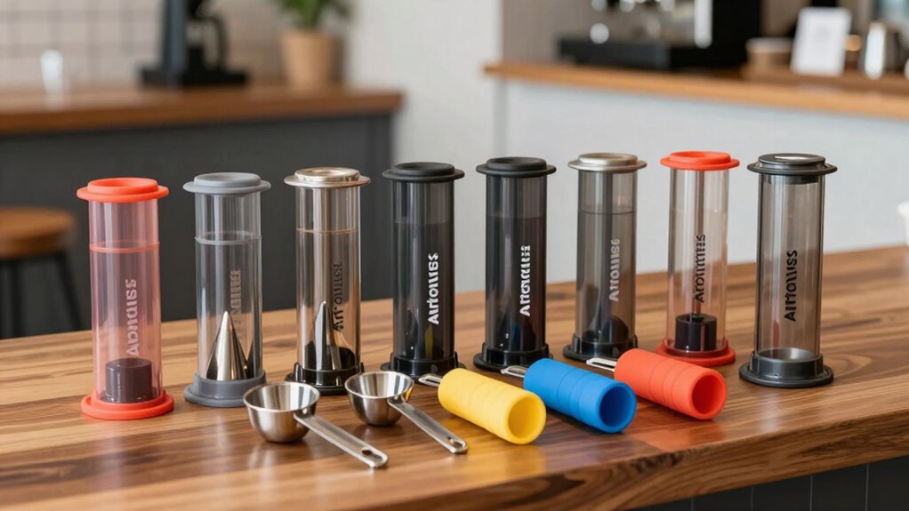 If you’re serious about elevating your AeroPress game, investing in a premium accessories bundle is like adding a secret weapon to your coffee arsenal. From sleek stands to reusable filters, these bundles make brewing smoother and more enjoyable—think of it as upgrading from a chariot to a spaceship! So, go ahead, pick the one that suits your style, and turn every brew into a delightful adventure. Cheers to better coffee—may your mornings be forever energized!